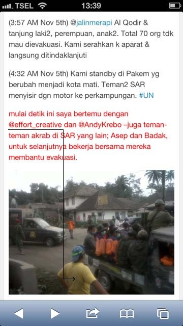5 November 2010, 02:00 dini hari, erupsi besar gunung Merapi mengguncang Jogja dan sekitarnya, ratusan ribu penduduk yang tinggal di sekitar lereng Merapi seketika berbondong-bondong mengungsi ke tempat yang relatif aman. Tapi malam itu aku memutuskan menantang bahaya dengan naik mengendarai mobil pick up, melawan arus pengungsi, menuju ke lereng Merapi untuk membantu evakuasi. Aku tidak tega membayangkan nasib saudara-sudara kita yang terjebak di desa-desa terpencil di lereng Merapi itu. Sekitar pukul 04:00 aku bertemu dengan Kebo, sapaan akrab Yoga Cahyadi alias Bobby Yoga, di depan kecamatan Pakem yang berubah menjadi kota mati. Kita menunggu fajar di sana untuk kembali menyisir kampung-kampung yang dilanda bencana.